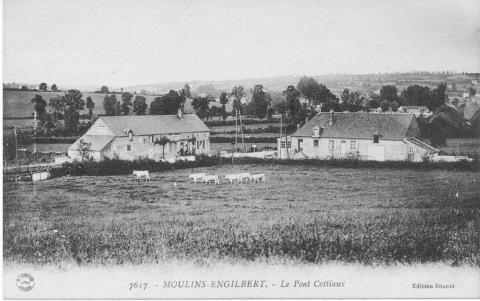 Si ce pont, sur le ruisseau du Pont de Cottion, date de la première moitié du XIX e siècle , son origine pourrait remonter au XVIIIe. La carte Cassini semble indiquer, sur la route royale de Château- Chinon à Decize via Moulins-Engilbert, un passage à sec. En tous cas le pont apparait nettement sur le cadastre de 1842, mais pas sur la carte Cassini du XVIIIe. Très remanié , élargi et bétonné, il a perdu son aspect initiale de pont à un arche surement en pierre taillé. Un visuel début du XX e nous le montre avec ses parapets en fers forgés, mais aussi large. Antérieurs aux années 1840, les ponts en pierre ou autres ouvrages (en pierre-bois), étaient trop rares en Morvan, pour ne pas les inventorier. Il fallut attendre les années 1840-50 et suivantes pour voir se développer le réseau routier du Morvan et aussi la construction de nombreux ponts en pierre. Sur certaines rivières, en sus du passage à gué, on pouvait trouver une passerelle charpentée tout en bois, afin que piétons, cavaliers et selon la route, attelages, « passent à sec ». Pour les ruisseaux et rus, une dalle de granit (ou pierres) ou une poutre pouvaient être étaient posée entre deux rives, sinon des pierres placées dans le lit du ru.
