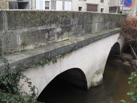 Enjambant le Garat, ce pont en pierre date du début du XIX e siècle. Il est nettement indiqué, avec ses deux arches, sur le cadastre de 1842. La carte Cassini (v 1760) indique la route royale de Moulins à Chatillon en Bazois mais pas de pont semble t il. Selon une archive citée par J. et S. Bernard, au milieu du XVIII e siècle, on bâtit une passerelle en bois pour les piétons et cavaliers. Ainsi, malgré sa demande, le carrosse de Mr de Ganay continua de passer par le gué… ". Des gravures anciennes de la ville fortifiée montrent des ponts en bois . Ils devaient être surement constitués de pieux, poutres et planches, donc facilement démontables en cas d'attaque en retirant quelques planches et poutres. De plus la carte Cassini indiques deux routes royales ce qui laisserait supposer certains passages à sec sur ces rares " routes carrossables" pour l'époque. Aujourd'hui restauré, il a gardé son aspect avec ses deux larges arches, sa pile centrale et ses parapets constitués de deux rangées de blocs de grès taillée. Les visuels anciens du début du XXe ne montre pas d'élargissement, ni reprise du pont. L' ancien passage à gué est toujours partiellement visible.