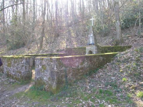 Surplombant le bourg, sur la Montagne de la Garde se trouvait une chapelle (aujourd'hui disparue et de localisation imprécise) objet d'un important pelerinage. Sa date de construction nous est inconnue. Cette chapelle était associée à une source à rite thérapeutique et aurait été remplacée par une statue toujours existante. M. Niaux précise qu'en 1657, une chapelle Notre dame en ruine "existait prés de la source et a été remplacée en 1836 par un petit édicule ". Elle n'est pas indiquée sur la carte Cassini (v 1750). Baudiau en 1854 ajoute : "Presque au sommet de la montagne, on voyait naguère une antique chapelle dédiée à St Claire et dont il ne reste plus de vestiges. Il s'y faisait anciennement un pèlerinage important." On venait nombreux à la source pour guérir des yeux et en période de sécheresse. Était elle sur ou prés du sommet ou prés de la fontaine ?Aujourd'hui se trouve dans un enclos maçonné, un puits fermé, ouvragé surmonté d'un niche en forme pyramidale dans laquelle est posé une statue de la vierge. Des ex-voto et fleurs animent ce site toujours fréquenté et vénéré. Plus haut dans une clairiére du bois, domine la statue de la vierge.