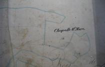 Isolée sur le sommet du Mont Saint-Marc, où se trouvait un vaste oppidum "gaulois" (1ère et 2ème murailles encore très visibles), se trouve une chapelle d'origine médiévale, mais imprécise. Cette chapelle était liée au pèlerinage de la fontaine St Marc. Baudiau la cite comme "prieuré simple appartenant à l'Abbaye de Moutier Saint-Jean" (comme l'ancienne église paroissiale St Martin dans l'ancien centre du village,voir fiche). Une archive mentionne en 1139 une chapelle du prieuré; mais est celle ci ou celle egalement prieurale de St Martin au pied de la colline ? Elle nettement indique comme chapelle prieurale sur la carte Cassini du XVIIIe. Cette chapelle était liée à un très ancien culte et pèlerinage de la fontaine Saint-Marc (avec des rites thérapeutiques, voir fiche) située en contrebas et où a été trouvé un bassin gallo romain. Son origine n'est pas datée mais en 1634, le prieur Saint-Jean de la Maison "fit couper les bois et répara la chapelle". Tombant de nouveau en ruine, elle fut reconstruite à neuf en 1680. Elle avait 20 pieds de long sur 15 de large hors murs, et les murs étaient de 2 pieds d'épaisseur. En 1851, par souscription faite par le curé (Abbé Baudiau), la chapelle fut reconstruite en grande partie. On voyait à l'intérieur un bas-relief datant de 1509 (disparu). Aujourd'hui, cette chapelle privée, de plan carré couverte, sert de caveau à la famille de Chaumaille et doit être restaurée par un mécène.