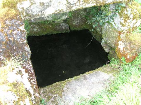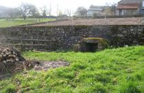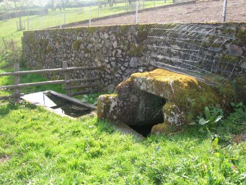Fontaine construite en pierre de taille au bord d'un chemin. Une auge est placée à coté.