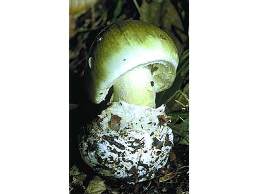 Chapeau : 7 à 15 cm de diamètre, convexe à aplati, vert jaunâtre, soyeux, brillant par temps sec, fibrillé radialement de blanc verdâtre, à vert olive ou brun olivâtre, marge grisâtre lisse aiguë, très rarement persistance de fragments de voile blanc sur le chapeau. Jeune ce champignon, naît d'un sac ovoïde blanc, partiellement enterré, formé d'un voile blanc se déchirant par le sommet et laissant apparaître le chapeau olivâtre d'abord conique puis vite étalé.