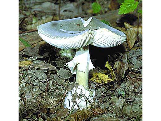 Pied : de 8 à 20 cm, épais de 1 à 2 cm cylindrique, plein, se creusant avec l'âge. Base bulbeuse contenue dans le sac blanchâtre déchiré : la volve; l'intérieur de la volve est quelquefois verdâtre. Ce pied est blanc, lisse au dessus d'un anneau blanc strié, chiné de verdâtre plus ou moins foncé au dessous.