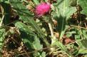 Plante mi-haute, dressée, à tige simple, grisâtre. Feuilles poilues, de forme allongée et à lobes pointus, bordées d'épines molles. Un seul capitule composé de fleurs en tube purpurines.