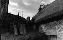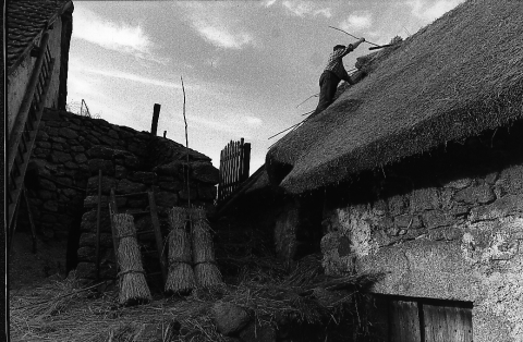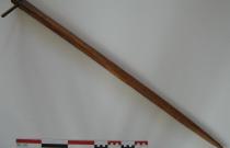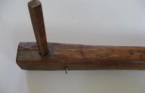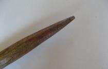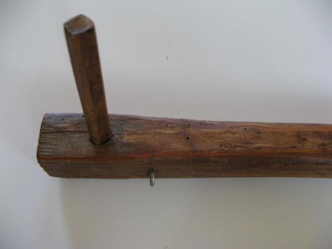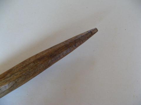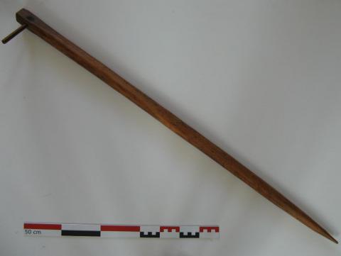 Cette aiguille appelée localement bâton, servait à pousser les perches pour glisser les bottes de seigle. Elle aidait aussi à fixer un lien entre la botte et la branche de noisetier en soulevant ou tassant . Le petit bout de bois perpendiculaire situé à l'arrière de l'outil servait, une fois planté dans le toit de chaume, à ce que l'outil ne tombe pas.