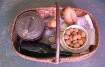 La photo numéro 6 est une reconstitution du contenu du panier réalisée par l'équipe du Musée de l’élevage et du Charolais de Moulins-Engilbert. Dans le panier, on trouvait le "quadrin" qui contenait la nourriture . On trouvait également dans ce panier : deux cuillères, deux fourchettes, deux quarts en fer, deux assiettes blanches creuses, une bouteille de rouge, un bol avec des noix, des œufs, du pain et un torchon pour se poser au sol.