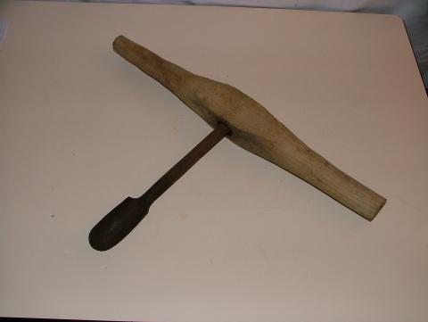 Les sabots étaient réalisées selon les régions avec du bouleau, frêne, aulne, hêtre, noyer… Le sabot de marche, de travail ou du dimanche se différenciait par l’essence du bois et sa finition (gravure, couleur, décorations ajoutées). La bûche calibrée pour faire un sabot est dégrossit avec une hache dite épaule de mouton puis un paroir fixé sur la billot ou banc de sabotier. Pour l’intérieur on utilise des outils qui selon l’usage et la région les noms peuvent varier de noms, mais nous retiendrons la terminologie suivante. Tarière torse ou en spirale qui perce des trous intérieurs, tarière creuse ou gouge et tarière à cuiller pour sabotier pour creuser et évider le sabot qui sera finit intérieurement avec le boutoir, la rainette et la râpe. Le fer est dit à tête plate car l’embout peut se fixer un manche en bois qui peut servir ainsi à plusieurs types Ci-après l’extrait d’un texte anonyme sur le travail de sabotier. « On l'entame (la pièce de bois dégrossie , futur sabot) au milieu avec une tarière, on le creuse avec la gouge ou la « cuillère » pour y ménager la place du pied, on le polit avec la « rase ». La tarière et la cuillère sont poussées de l'épaule et de la poitrine, debout, en pesant fortement sur le long manche en bois»